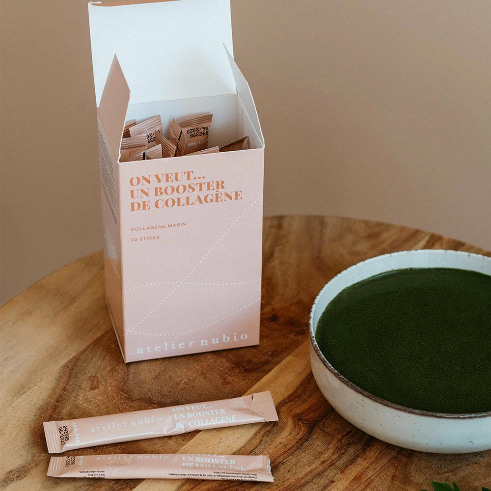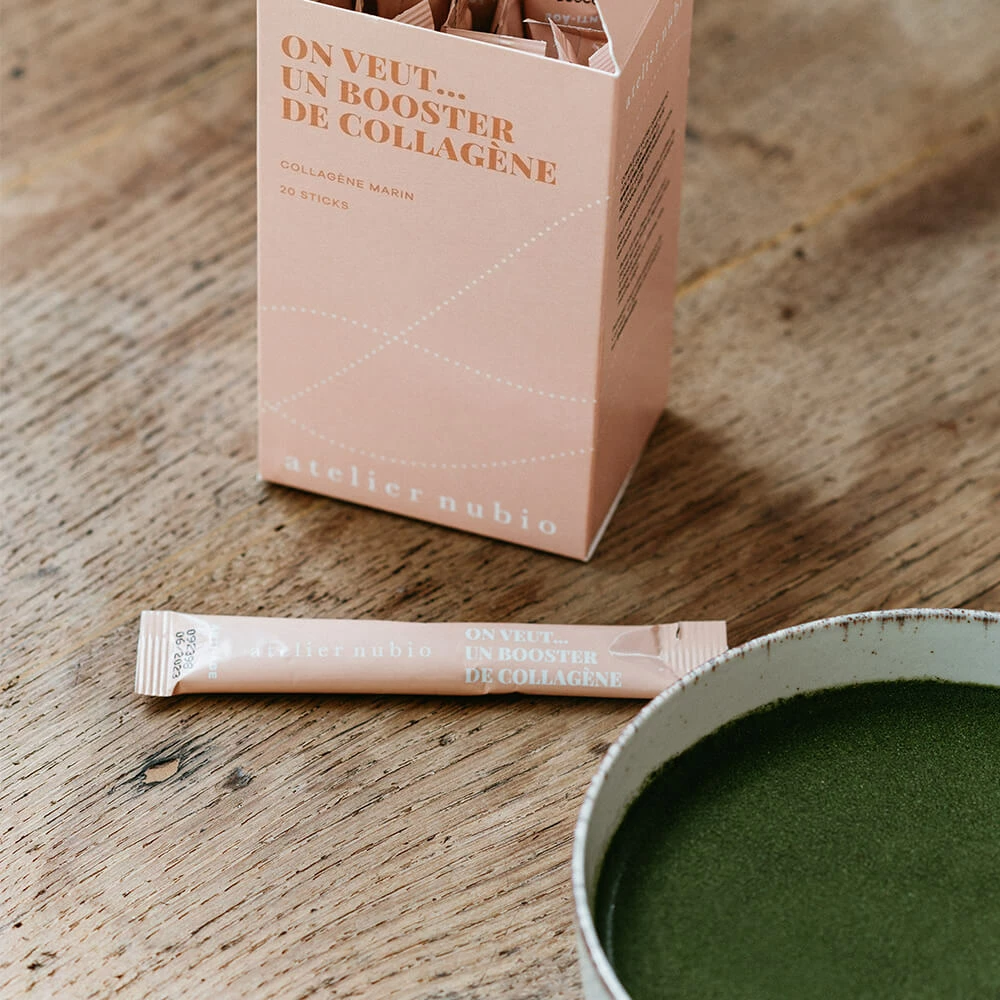 Des sticks de bouillon en poudre à base de peptides de collagène marin et de légumes verts, pour maintenir son capital collagène et conserver une peau rebondie.